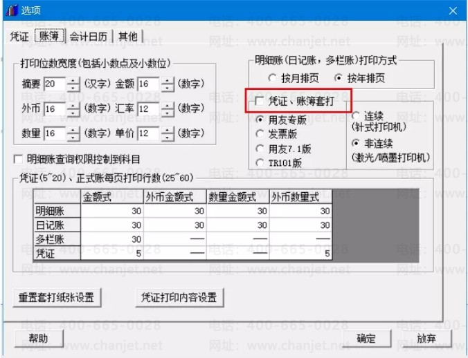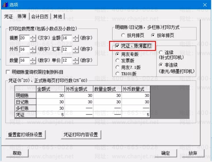 2、打印设置步骤:依次点击,总账-设置-选项-账簿-凭证账簿套打(不勾选),确定;