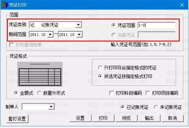 设置好要打印凭证的范围,这里选的是记账凭证,10月份的1-2号凭证,测试打印使用。点击【设置】
