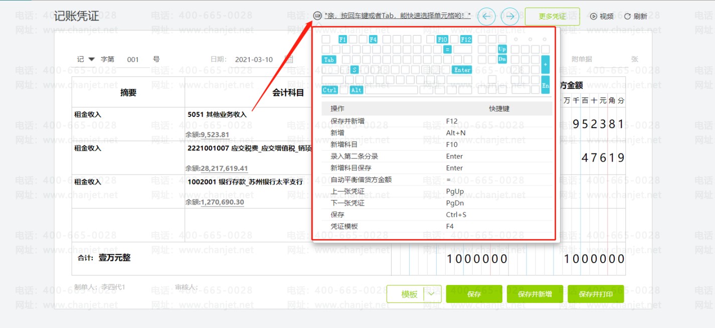 在录制金额时,可以用“=”号自动平衡借贷方金额,金额在借方和贷方之间切换用“空格”键,录入红字凭证时在录入金额出添加“﹣”号即可。同时这里还有个好用的小功能,就是在填制科目时,还能同步显示科目余额