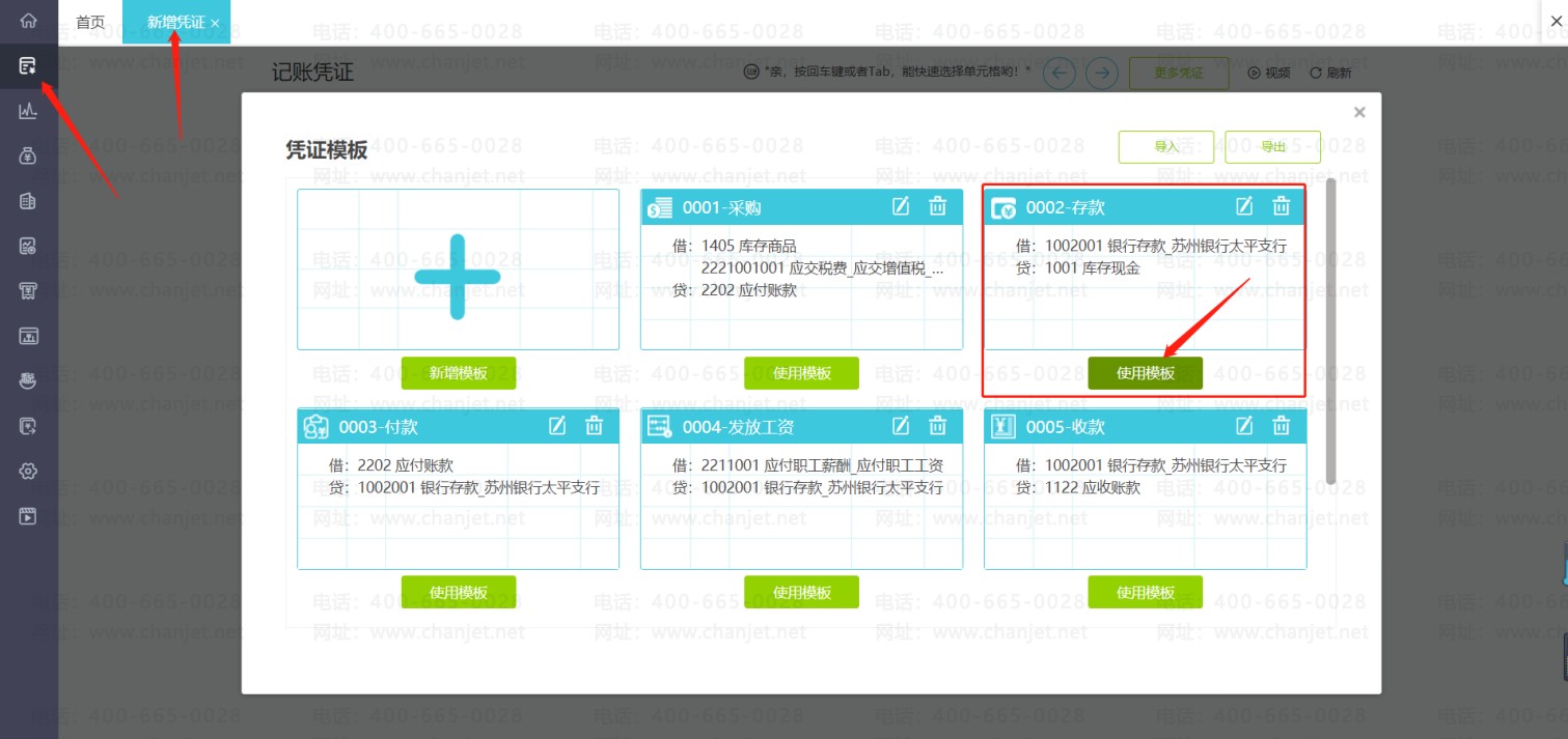1.点击【总账】-【新增凭证】进入记账凭证页面,点击【模板】-【使用模板】或使用快捷键“F4”,调用已有的存款凭证模板。