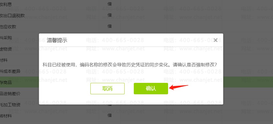 2、提示:科目已经被使用,编码名称的修改会导致历史凭证的同步变化。请确认是否强制修改?点击确认。