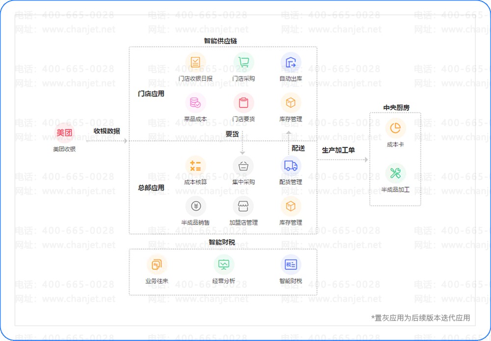 在这个市场背景下,畅捷通与美团达成战略合作。打造针对餐饮企业,特别是连锁餐企的一体化解决方案。即点餐收银和会员系统可以使用美团的SaaS产品;供应链、生产加工、财税系统使用T+Cloud。为此T+Cloud增加了餐饮行业特色功能,专门打造了“美团专版”产品。