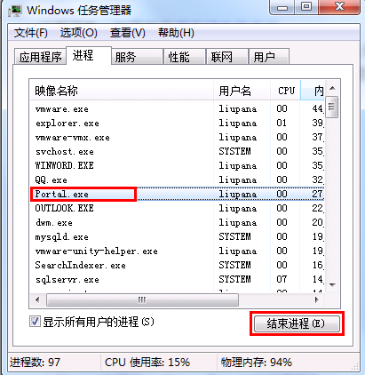 按“ctrl+alt+delete”三个键进入任务管理器(或者右击电脑任务栏空白处,选择任务管理器),在进程中找到 portal.exe 进程,点中它,选择“结束进程”,如下图所示