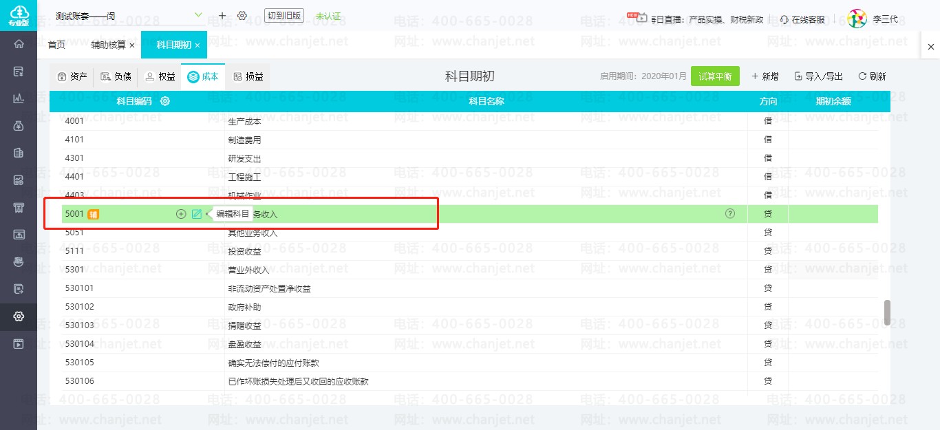 ②各门店相关收支科目挂上部门辅助核算项。如:主营业务收入、应收账款等。依次点击【设置】-【科目期初】-选择相应会计科目-【编辑】-勾选【部门】辅助核算。