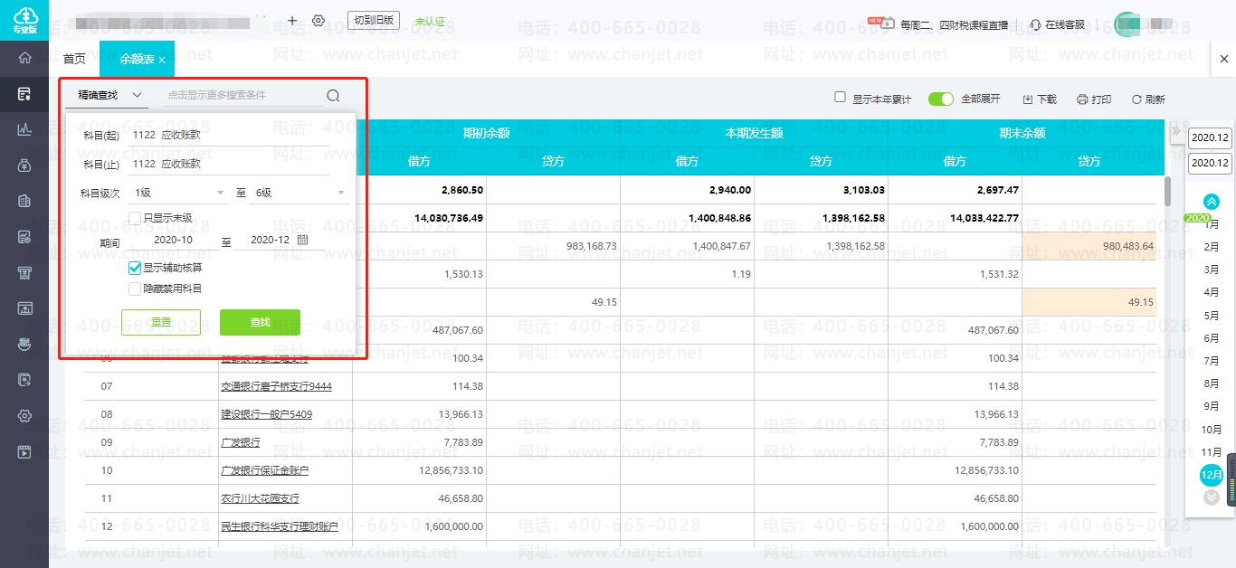 第三步:根据数据分析需求输入科目范围(应收账款)、时间范围(第四季度)等自定义信息,就可以精确查询财务数据了~