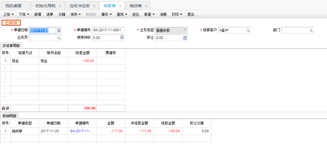 点击收款单上的“选单”选择退货单,核销退货单生成的红字应收款