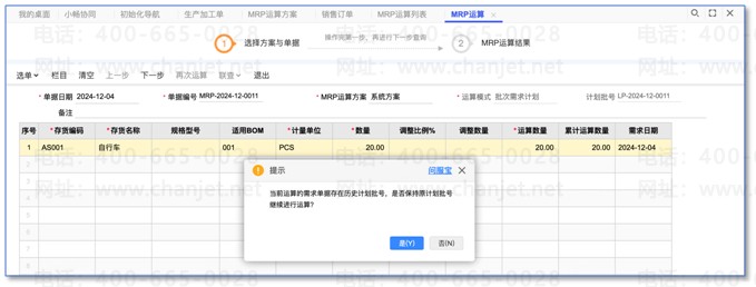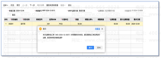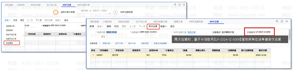 •对已运算的订单直接选单运算时,系统会自动检测是否有唯一的历史运算计划批号。选择使用历史计划批号后,系统更新本次运算单的计划批号,针对该计划批号计算差额供应量;若选择新计划批号,本次运算作为新运算,不响应上次运算后的变化。