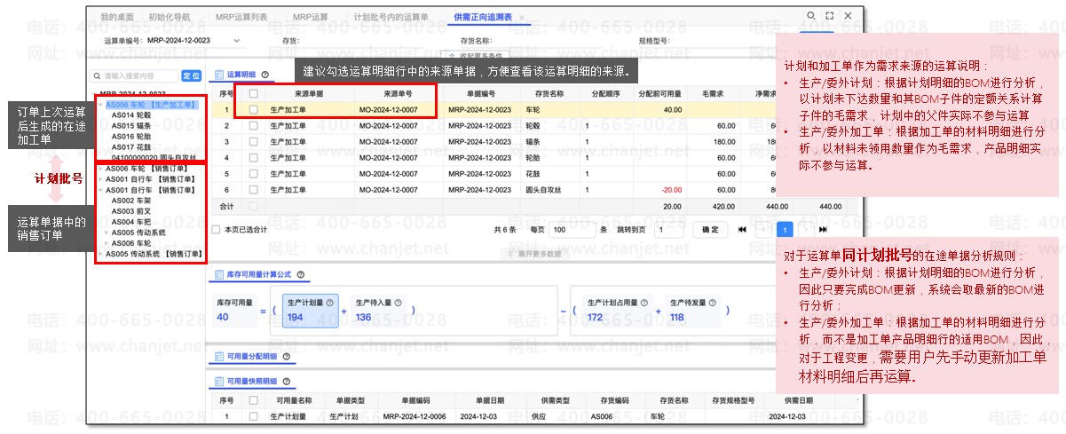 •系统根据上次运算生成的计划批号,展开所有在途的生产/委外计划和加工单展开进行供需平衡分析。
