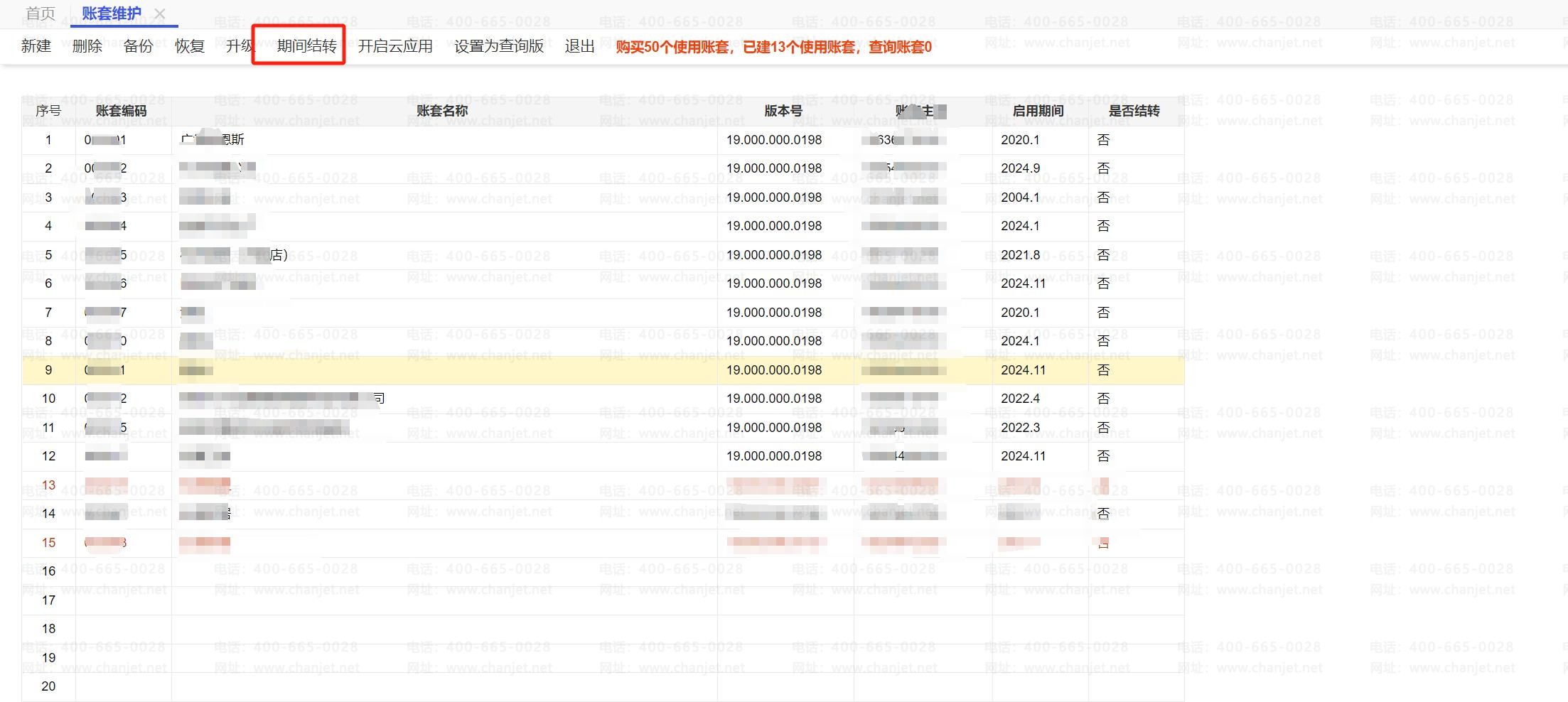 b、选中要进行期间结转的账套,点击“期间结转”,如下图所示:
