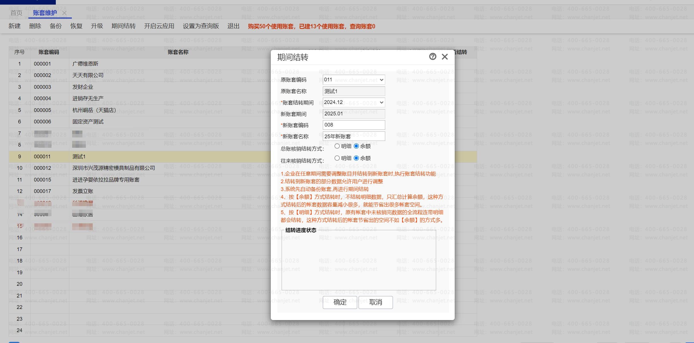 c、此时需要注意选择账套结转期间,这里可以是任意期间,如下图所示的结转情况是 2024 年 12 月进行期间结转,同时新建 2025 年的期间: