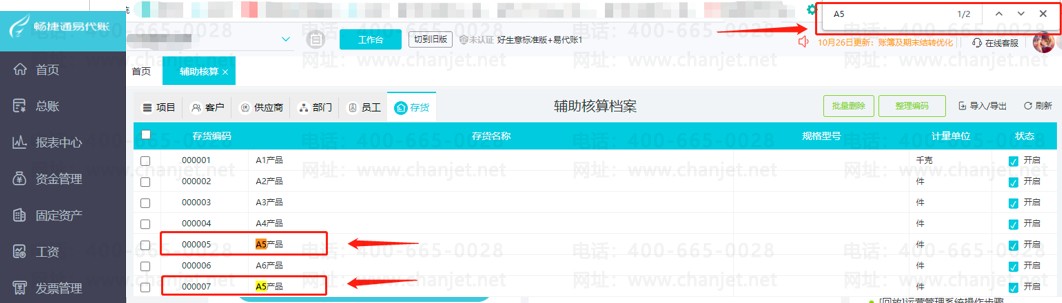 2.以存货辅助核算档案为例,在界面点击Ctrl+F, 查找需要检索的存货关键词,系统会自动识别相同的存货名称并标亮显示
