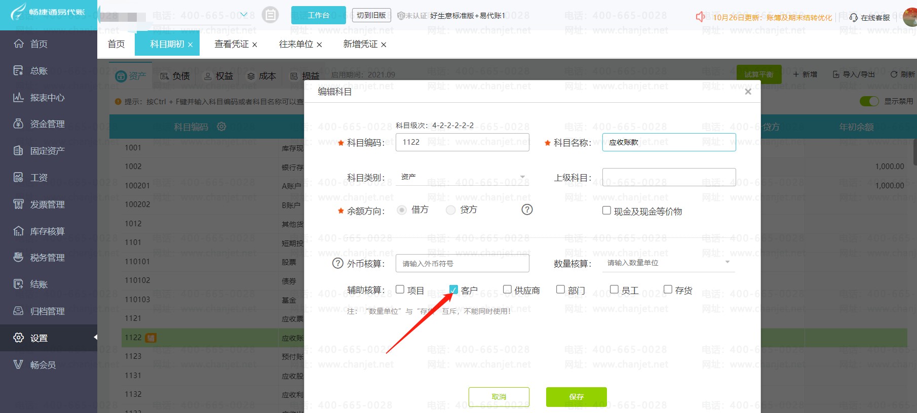 2.在【设置】-【科目期初】,鼠标放在【应收账款】科目名称上,点击【编辑科目】,取消勾选的辅助核算类型,再点【保存】。