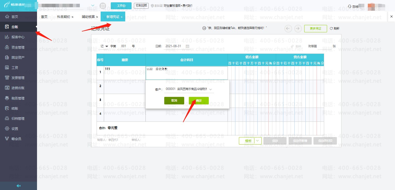 3..填制凭证时,涉及到挂了辅助核算科目的,系统会自动跳出选择框,您选择具体客户后点击【确定】
