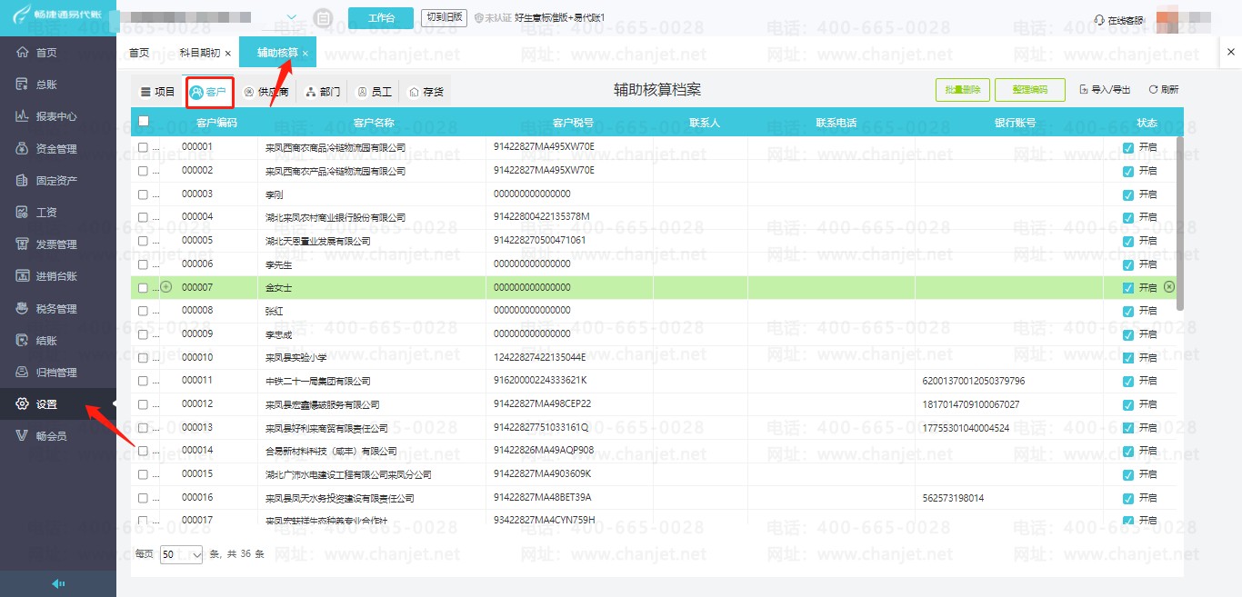 2.维护辅助核算档案信息,点击【设置】-【辅助核算】,进入辅助核算档案,把客户信息填写好