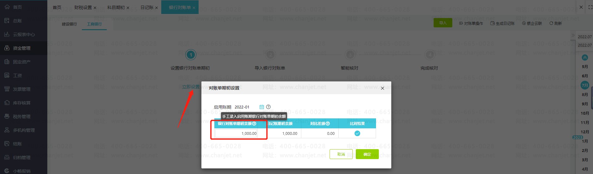 路径:【资金管理】-【对账单】-【设置银行对账单期初】