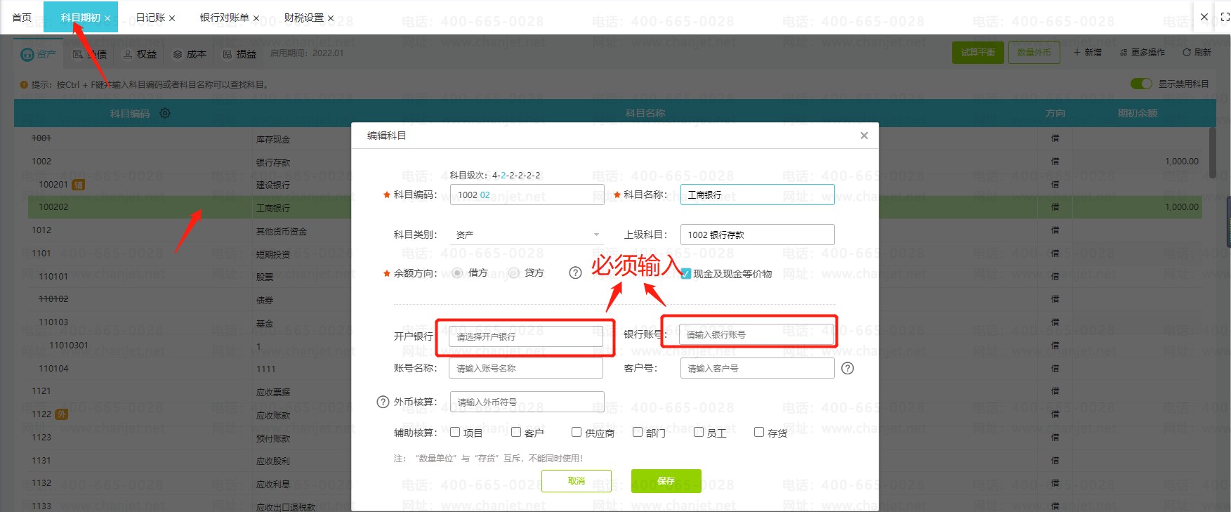 2、需要在【基础设置/设置】-【科目期初】中维护科目对应的银行户名和账号信息