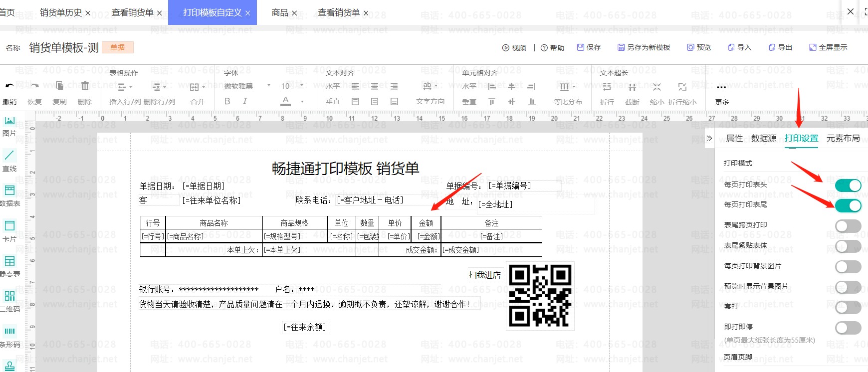 1、打开【系统管理】-【打印模板设置】的界面,打开需要设置的模板,点中右边【打印设置】,【每页打印表头】、【每页打印表尾】选择【是】: