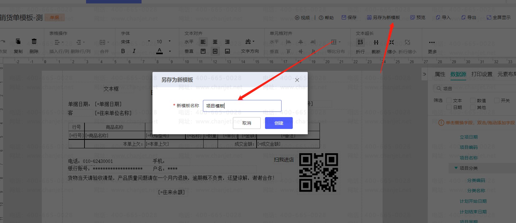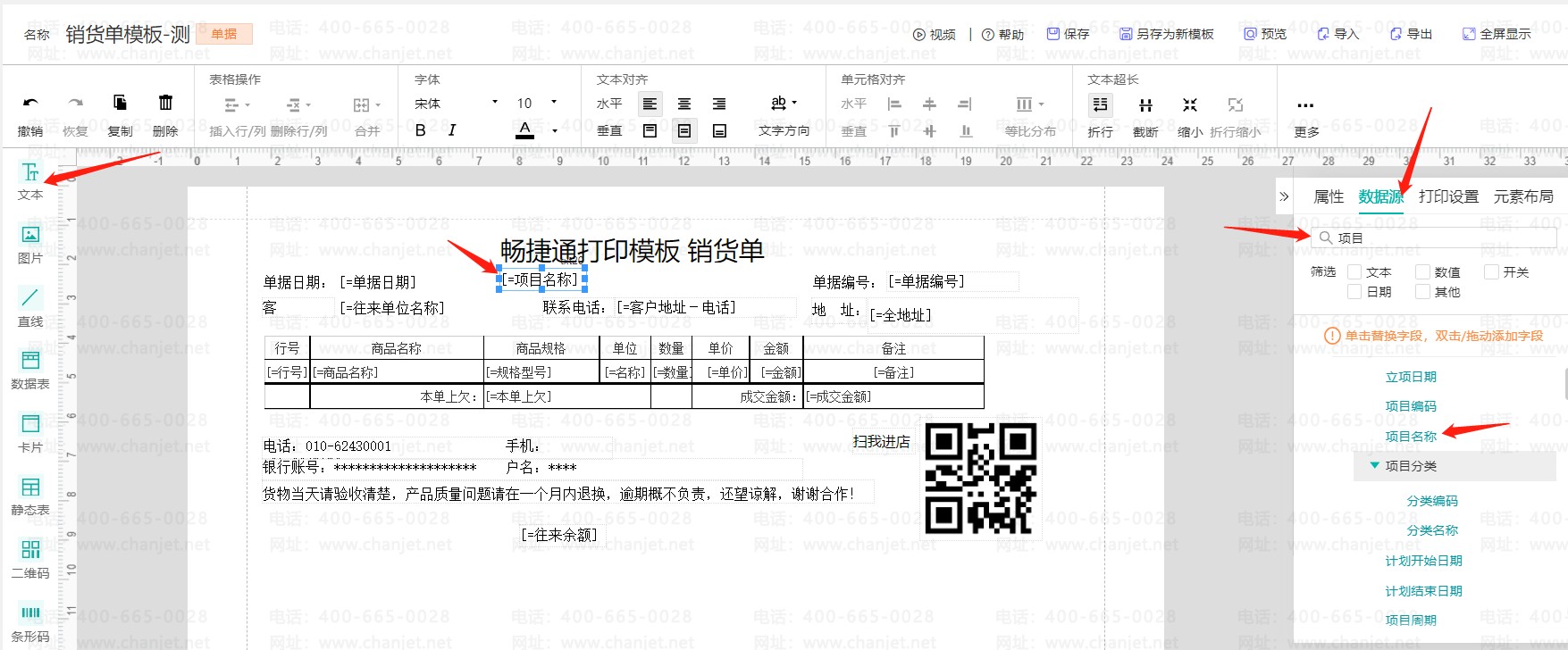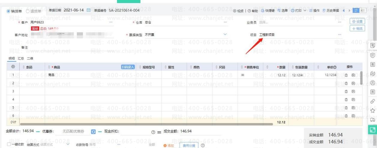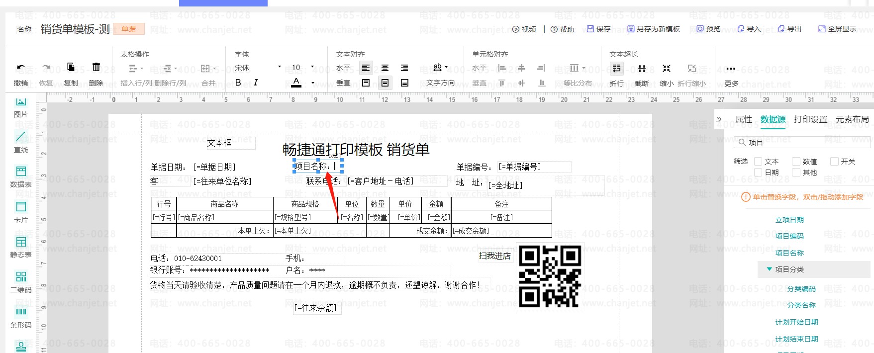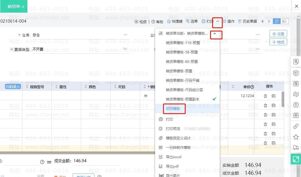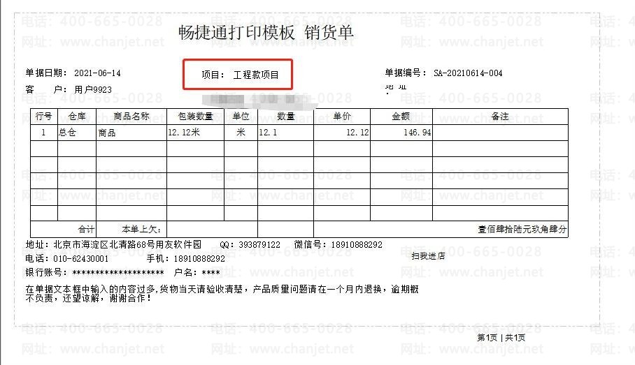 例如销货单打印模板表头增加【项目】