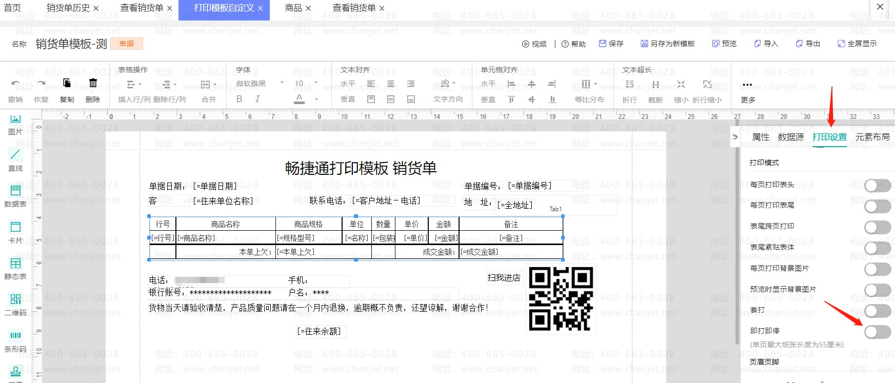 1、打开【系统管理】-【打印模板设置】的界面,打开需要设置的模板,在【打印设置】中勾选【即打即停】: