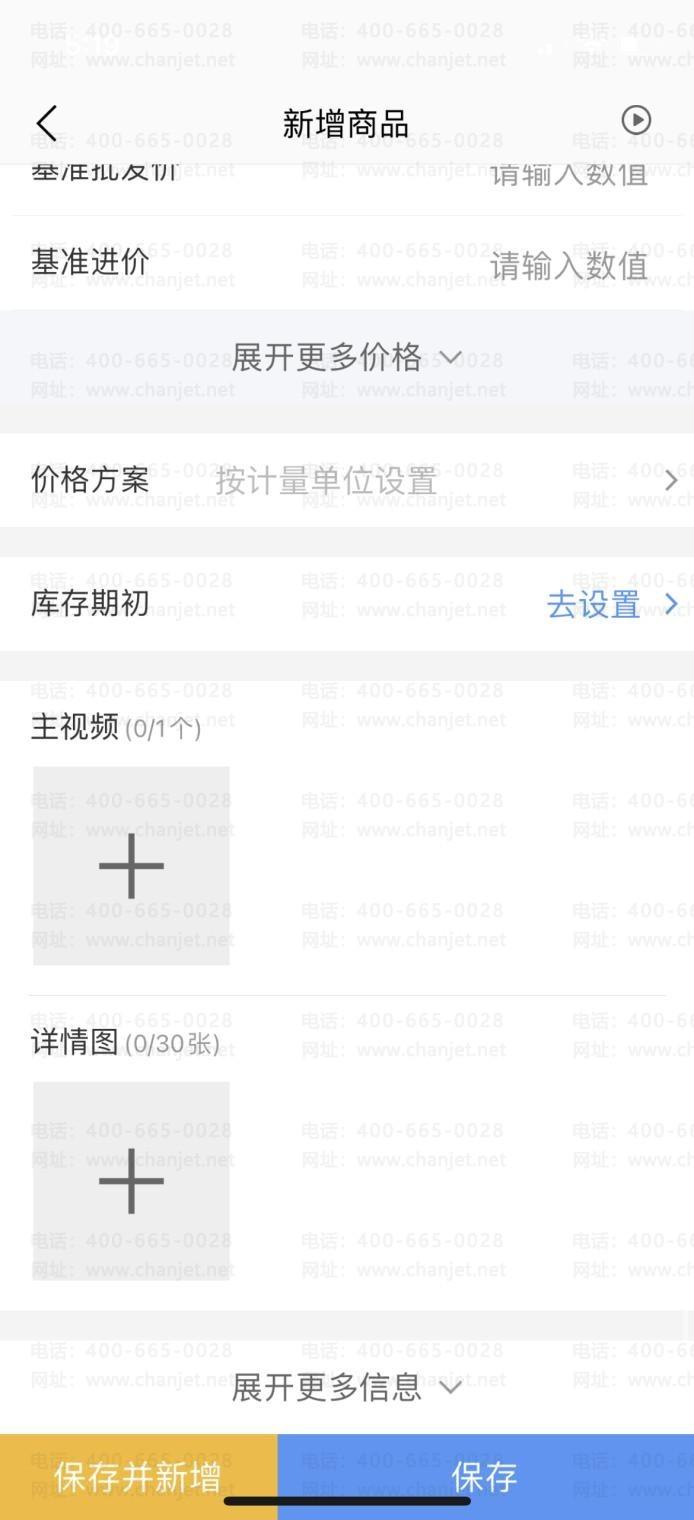 1、登入好业财手机 APP,点击【我的】--【基础档案】--【商品上新】--【手动上新】,在新增商品界面,输入相关商品信息档案之后,往下滑,点击【更多信息】再往下滑,点击【库存期初】--【去设置】,在相对应的仓库填写入数量以及成本单价。