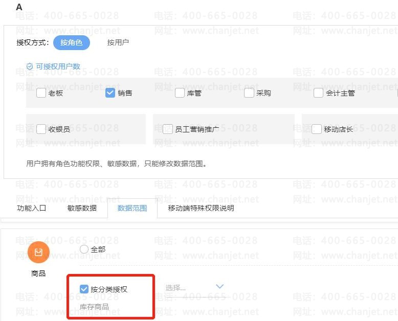 一、按明细授权:授权只能看到某些商品做的单据,并且做单的时候也只能选到某些商品