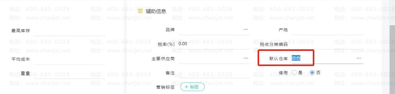 1、进入【基础信息】-【商品】商品档案右下角【辅助信息】-【默认仓库】维护好默认仓库信息。