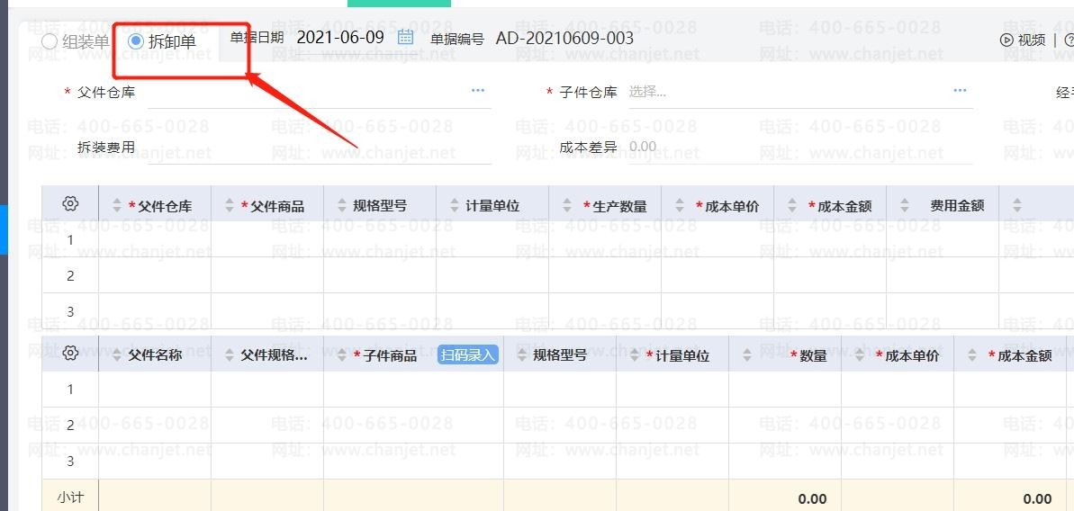 2、录入拆卸单的父件和子件信息两种方法: