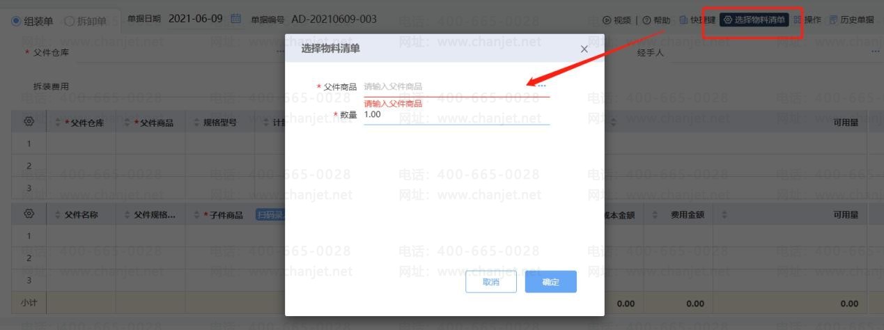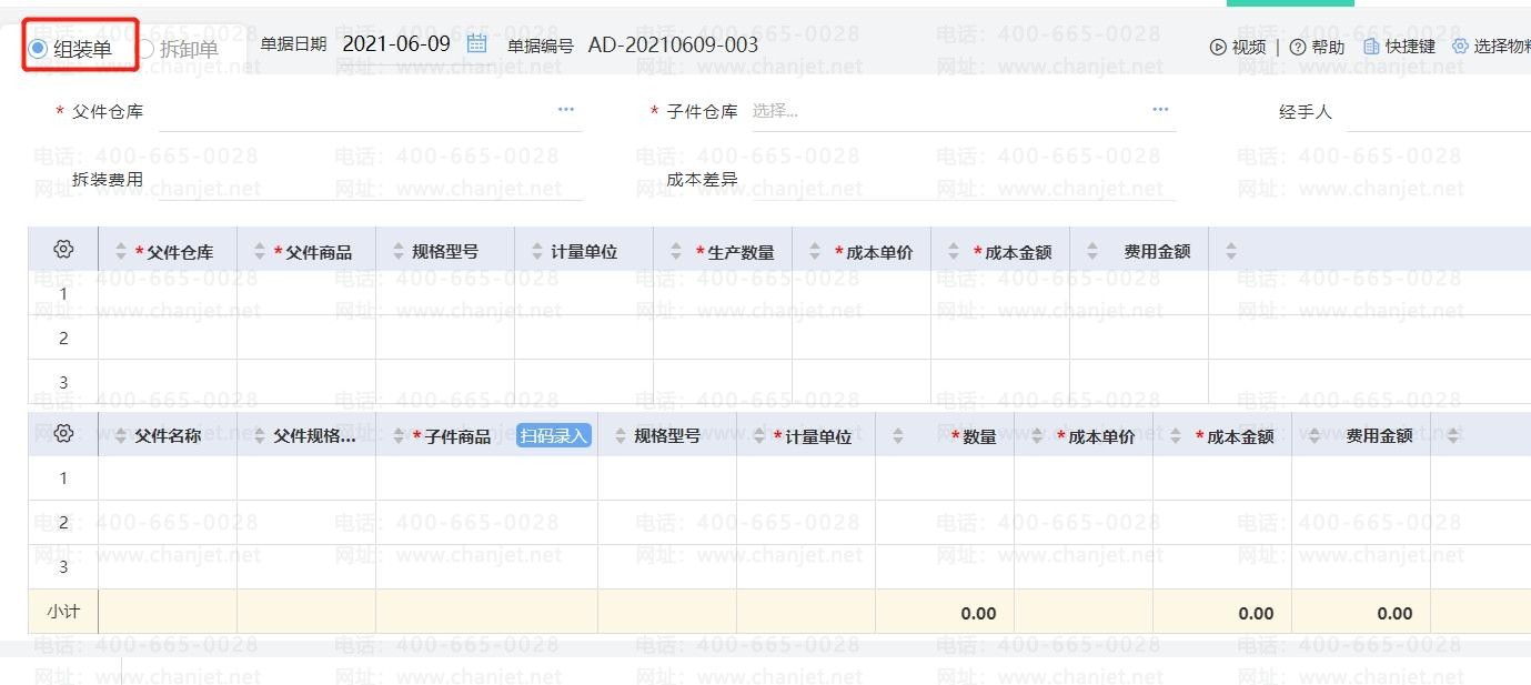 2、录入组装单的父件和子件信息两种方法: