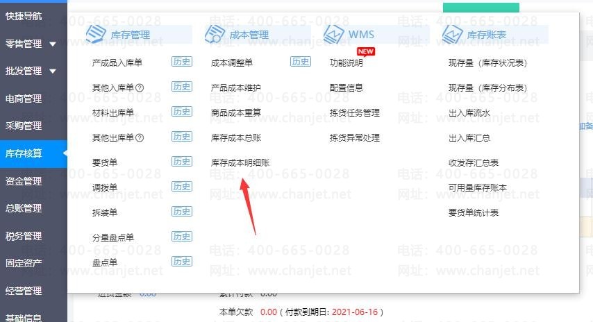 4、点击【库存核算】-【库存成本明细账】进去,选择仓库查询成本;可以看到, 赠品仓的结存成本为零。