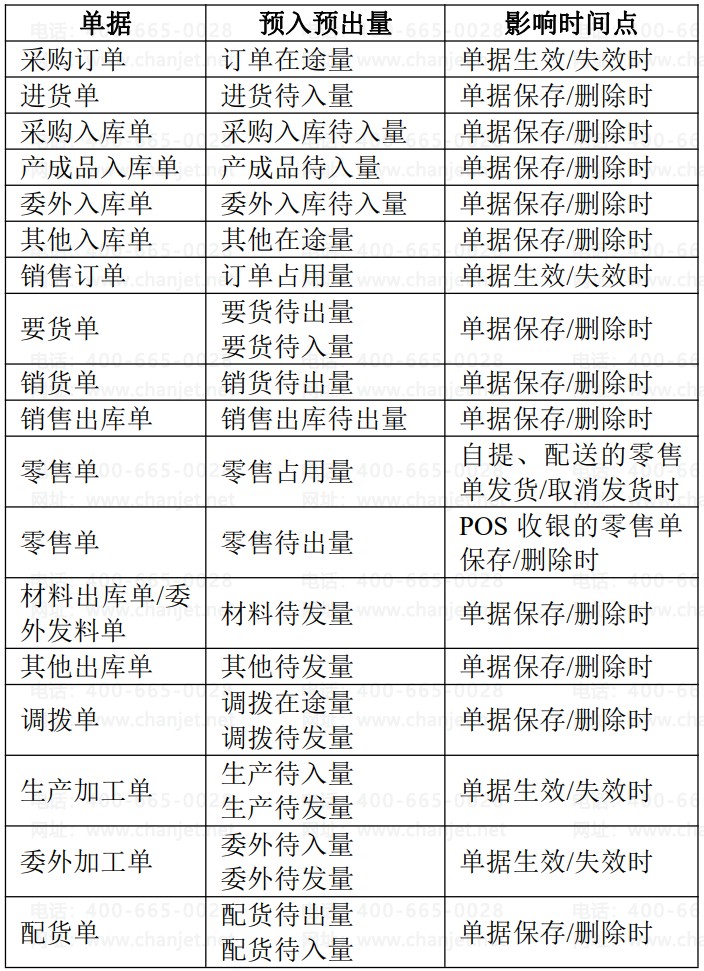 注:组装拆卸单、形态转换单、盘点单对可用量的影响是由这些单据生成的其他出 入库单而影响的。
