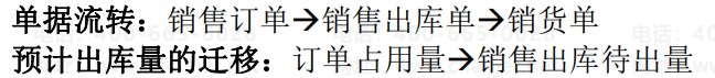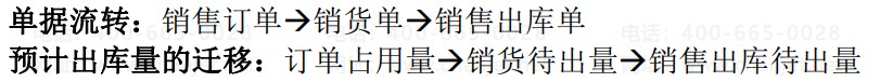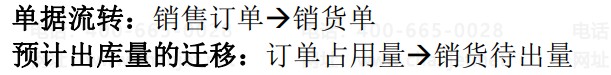 说明:当销售订单生效后,订单占用量增加;依据本订单完成销货单后,订单占用量减少,同时销货待出量增加;根据本销货单做出库单后,销货待出量减少,同时销售出库待出量增加。