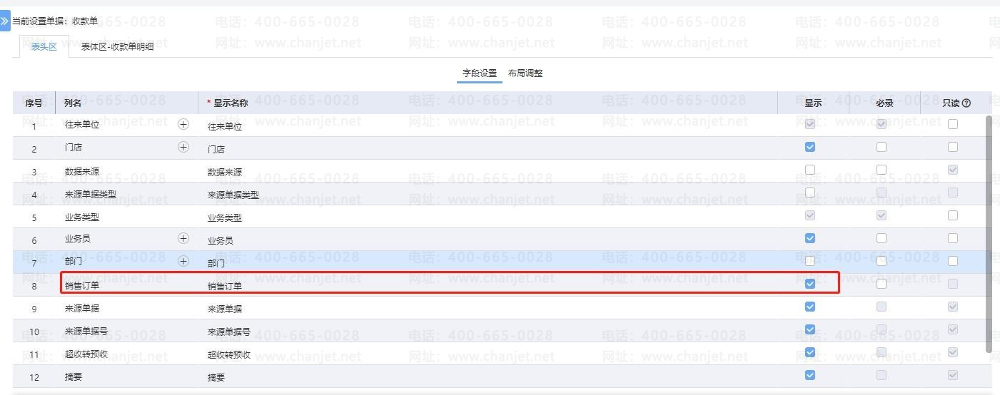 1. 点击【资金管理】-【收款单】,点击右上角【设置】按钮,把【销售订单】字段勾选显示: