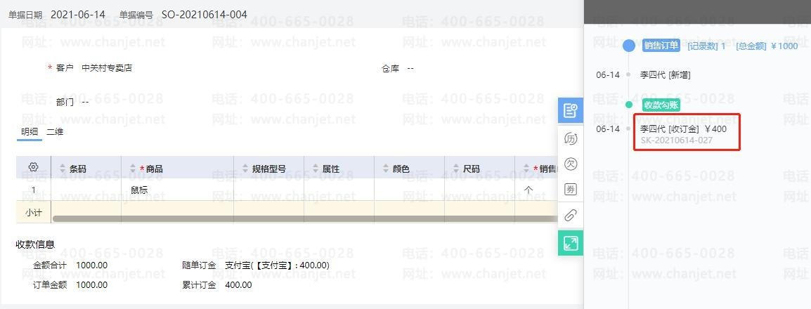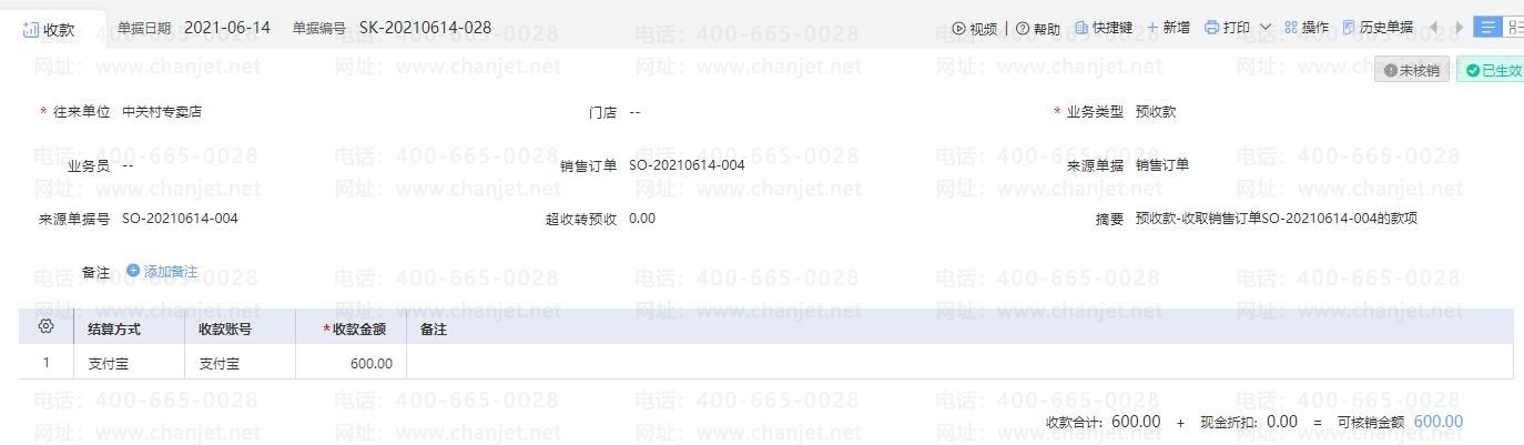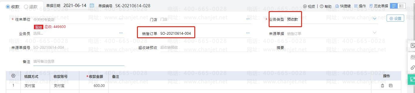 2. 带订金的销售订单保存之后会自动形成一张预收款单。