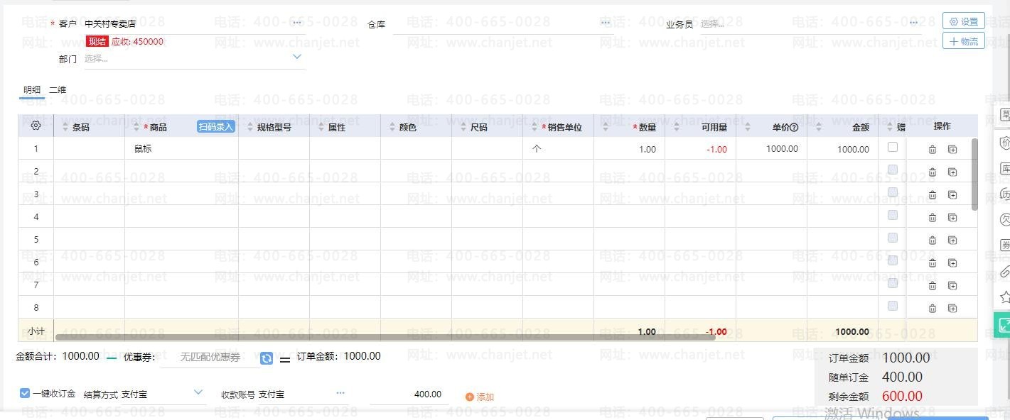 1. 点击【销售管理】-【销售订单】,新增一张销售订单,选择客户名称输入商品明细数量单价等信息后,找到单据下方的【结算方式】输入的金额就是本单的订单了: