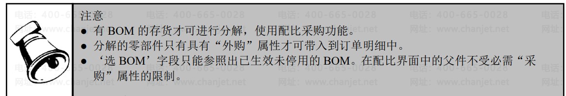 一种采购单据录入方式,起快速录入单据的作用。如果知道一个物料B的BOM 结构,而需要采购的物料是组成B的零部件,此时可以采用配比采购功能,通过录入B物料及数量,系统自动分解B成相应零部件,数量自动计算;这样通过录入一个B而得到了B的所有零部件,节省制单时间,起到快速录入订单的作用。