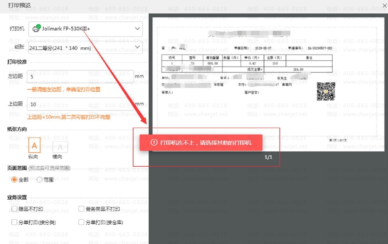 问题现象:单据预览中,打印机状态正常,但是打印提示【打印机连不上,请选择其他的打印机】?