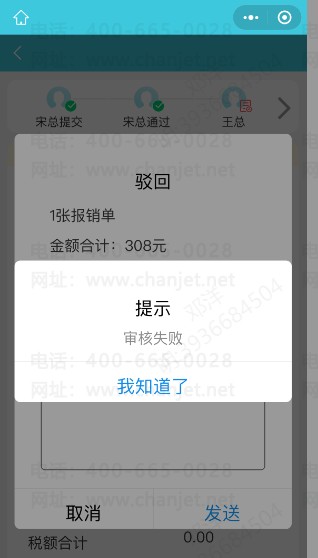 小畅报销小程序驳回报销单失败,提示审核失败。