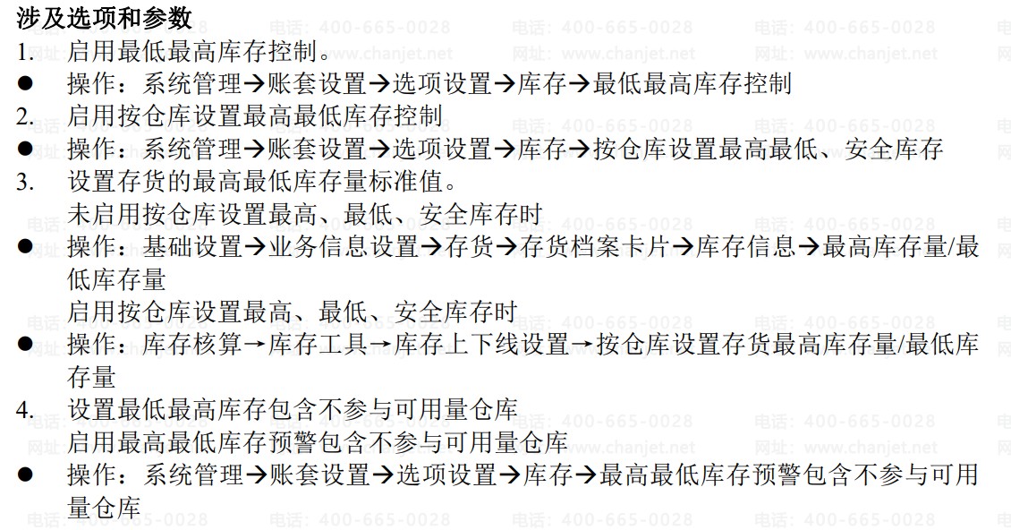 首先要启用账套选项中的“最高最低库存控制”参数,然后在存货档案中设置存货的最高最低库存量。