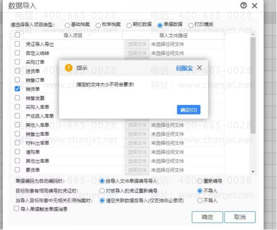 客户的销货单需要导入软件里面,数据量比较大,导入的时候提示‘指定的文件大小不符合要求’。