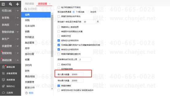 2023年4月份18.0版本,19.0版本以及T+C都做了限制excel导入的文件大小必须10M以内,建议不要一次性导入那么大的数据量,可以分多个excel导入,分多个excel导入的时候T+选项设置-公共页签导入最大数量需要设置一下,比如说excel里面有25000条数据,那么目前这里显示导入最大数量是20000条,那么就要改为25000,才可以导入进去。
