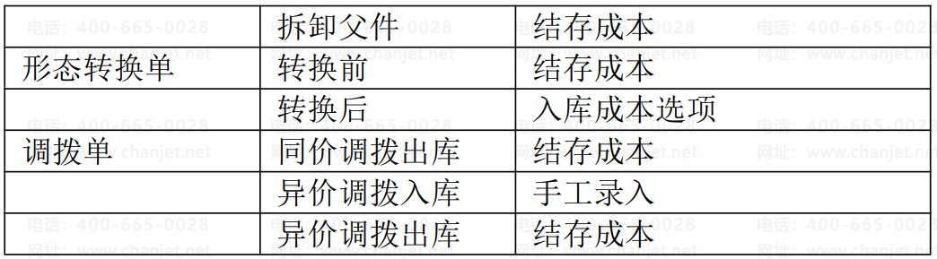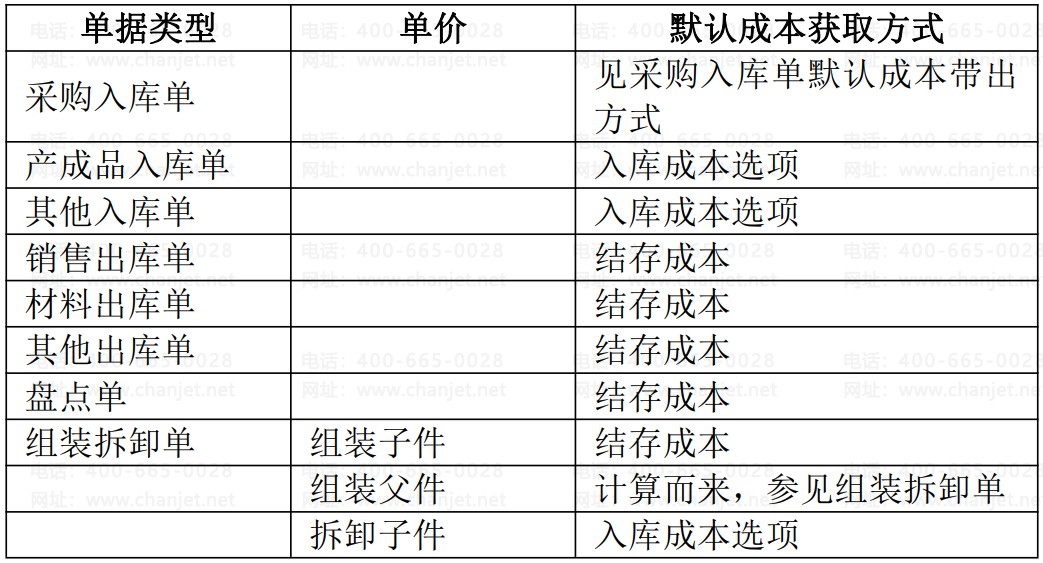 下表为各业务类型的单据默认成本带出方式。