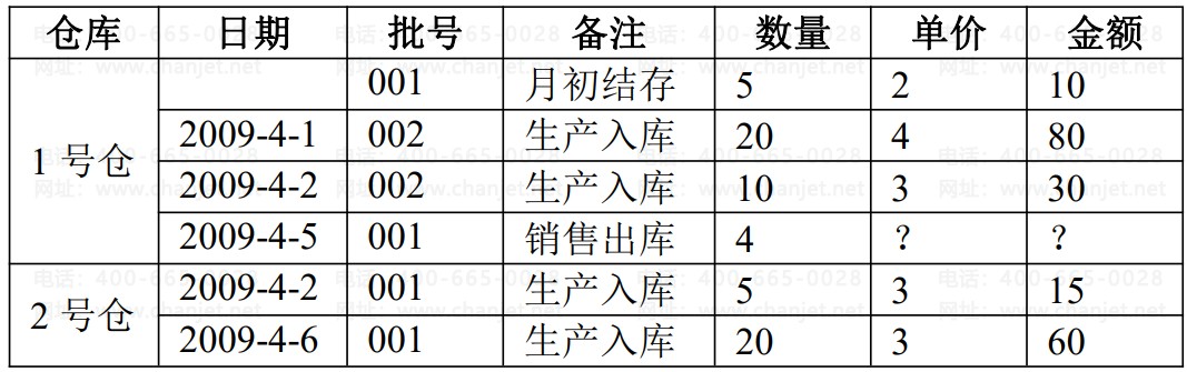 按“存货+仓库+批号”进行计价,即同一个批号的存货A按仓库分开计价,上述数据中,在对 2009—4—5日1号仓库领用出库的 4 个存货 A 计价时,是把1号仓库里批号为“001”的存货A所有数据放在一起计价,包括以下数据:1 号仓库月初结存为5×2=10。