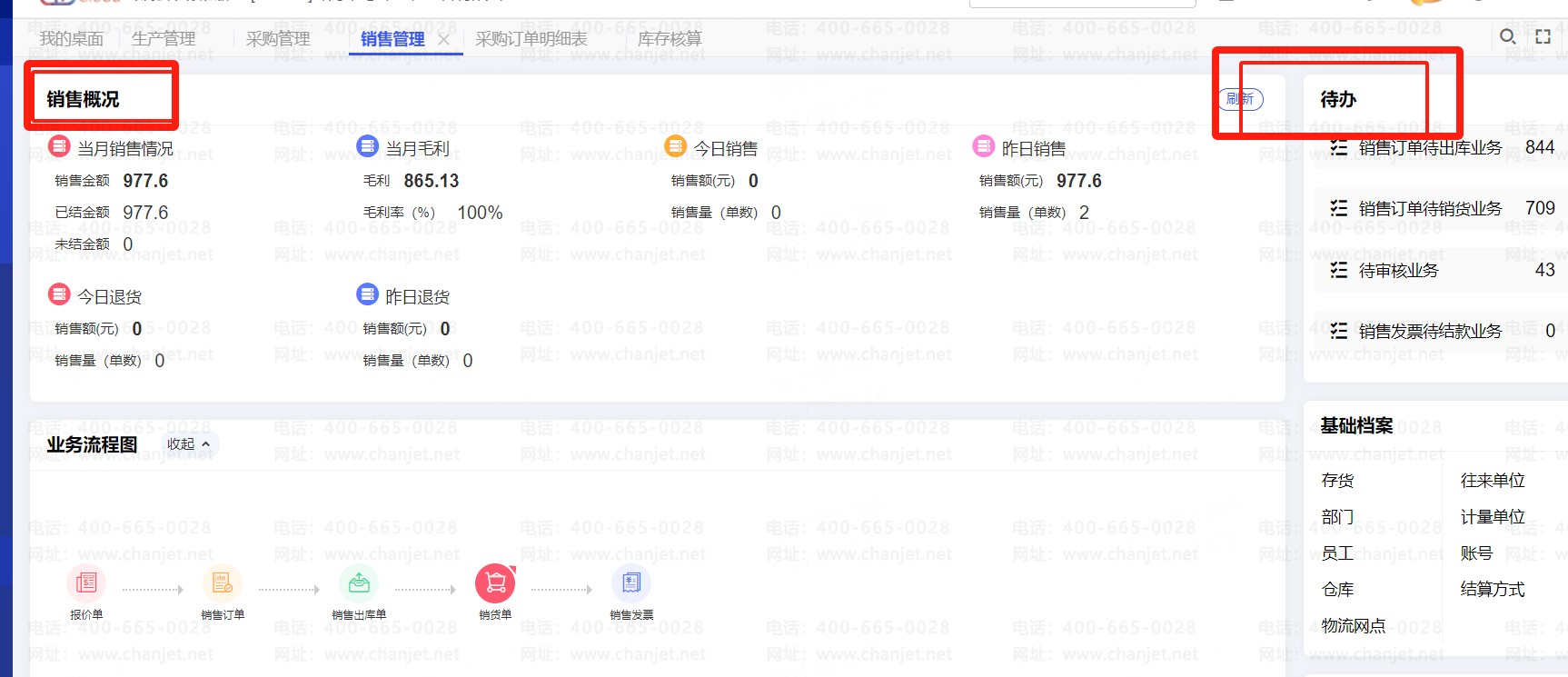 销售和库存管理的业务流程图界面既有销售概况、待办等信息;但是采购管理都没有,想问下概况和待办从哪里放出来?