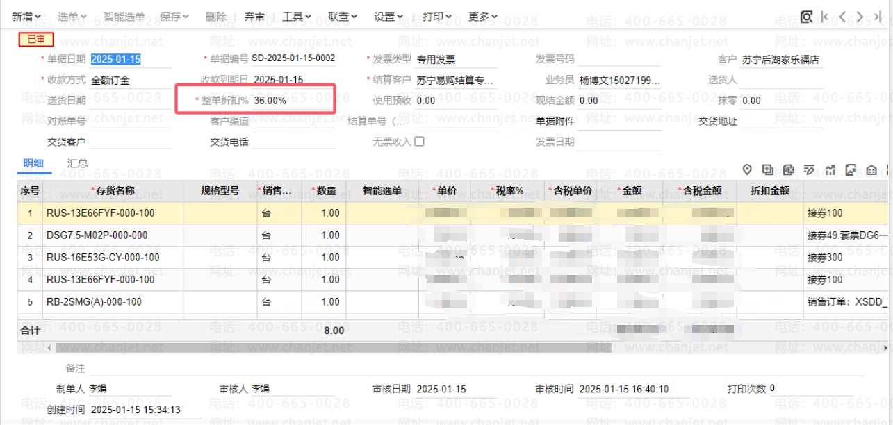 由销货单生单成销售发票,无论是输入整单折扣率还是输入每行折扣率,折扣金额不会计算,但是由手工建单的销售发票,输入两种折扣率都可以生效。