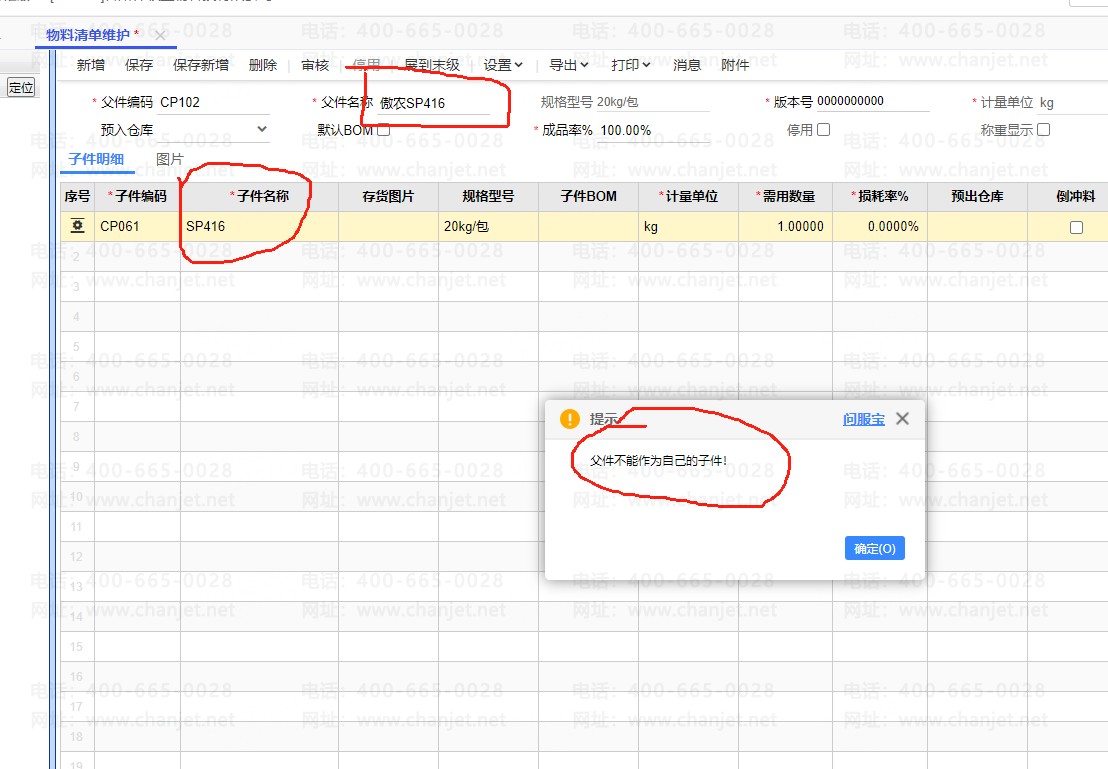 【问题答复】:检查其他的物料清单,有设置过其他的物料清单,父件作为子件的子件的情况,所以会有这个提示。