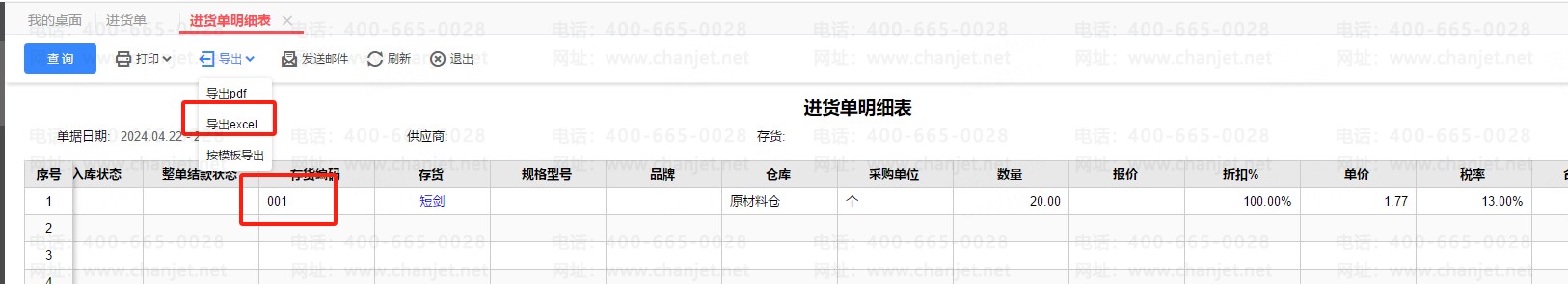 进货单在系统打开后有存货编码列,下载成EXCEL无存货编码列。