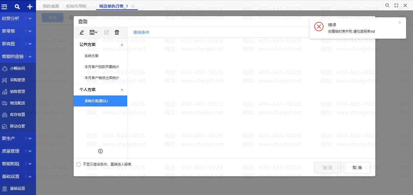 问题详情:销货单执行表报错:创建临时表失败,请检查报表SQL!