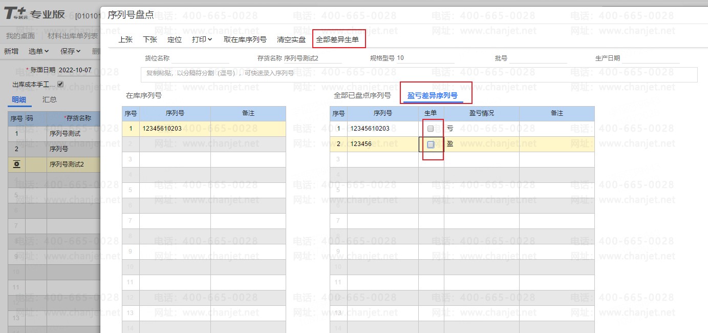 4、录入完后,在盈亏差异序列号中可以查看差异数据,并根据差异数据生单。