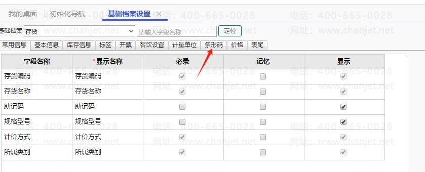 T+cloud基础档案怎么设置显示出存货的条形码选项,如下图,另一个账套里不显示条形码。怎么设置下可以显示出来?