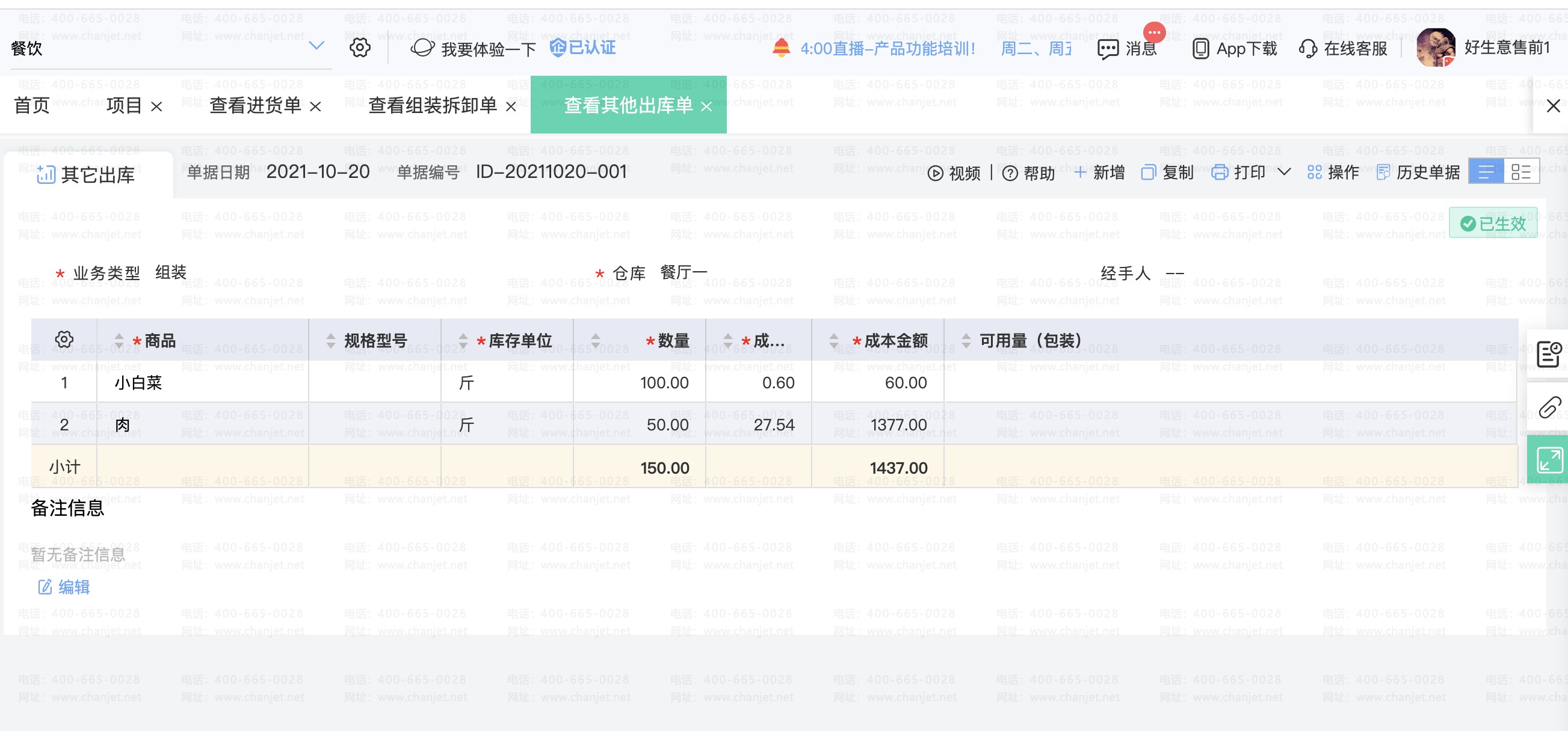 菜品做好后,组装单保存审核,自动生成原材料的【其他出库单】,材料领用出库: